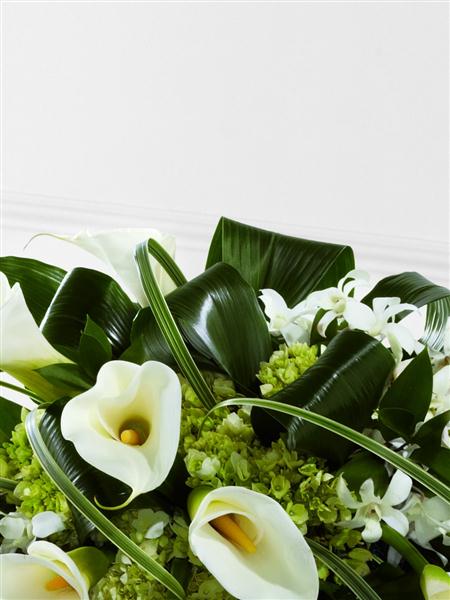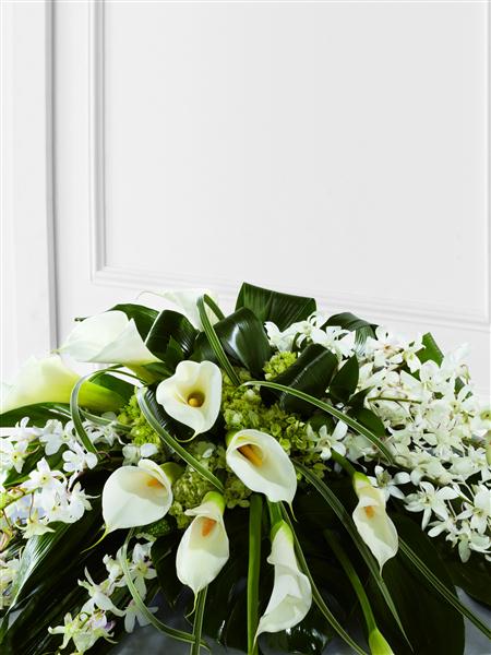 White Dendrobium orchids, white calla Lily, green hydrangea and a variety of lush green leaves are expertly arranged to create a very graceful casket spray.