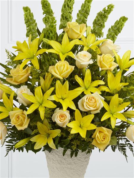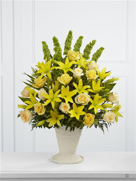 Yellow Asiatic Lily, roses and solidago are offset by cream roses, molucella, palm fronds and choice foliage to create a vibrant display. Arranged in a large papier mache urn, this beautiful display will make a lovely addition to the service.