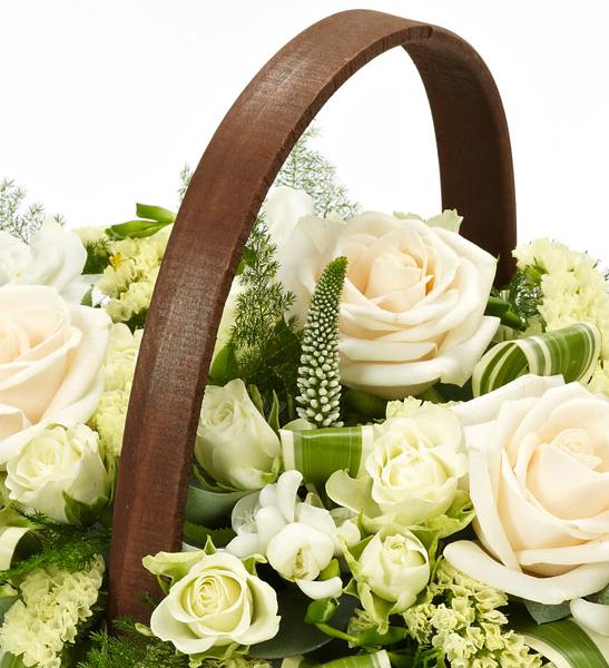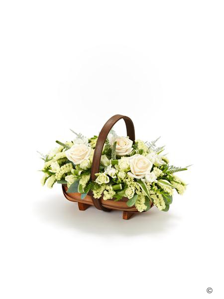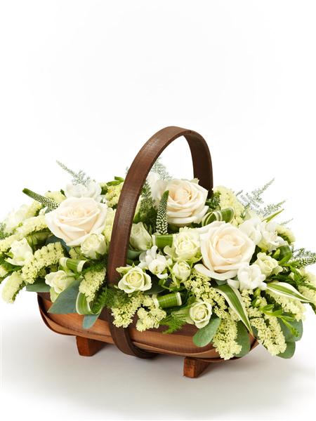 A traditional trug basket filled with roses, veronica, statice and scented freesias in fresh white with green foliage.