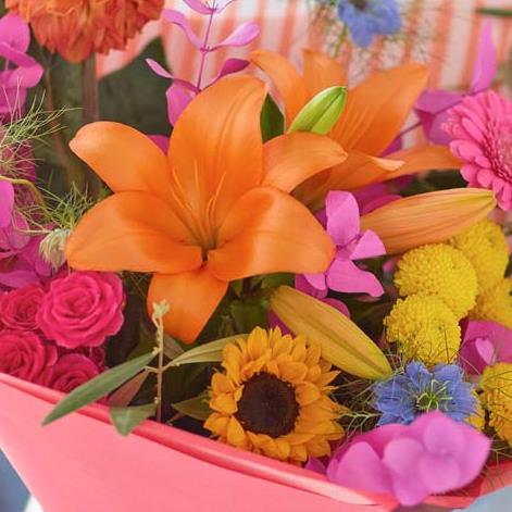 All the blazing colours of a carnivale (or a glowing sunset) captured in a gorgeous bouquet of the freshest blooms. Expect shades of cerise, saffron and tangerine with pops of blue. You might also see painted or dried foliage.