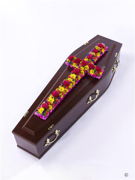 A classic cross covered with a mass of flowers in vibrant shades including roses, spray carnations, spray chrysanthemums and statice. Approximate height 122cm (4ft).