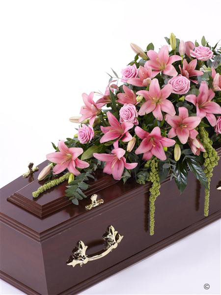 Beautiful Asiatic Lily and large-headed Rose in pretty pink are used to create this elegant casket spray. The fresh flowers are enhanced with trails of green amaranthus as well as ruscus, aralia leaves and eucalyptus. Approximate height 184cm (6ft).