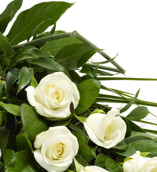 6 large-headed white roses are presented with aralia leaves, French ruscus and eucalyptus to create this simple, classic rose sheaf.