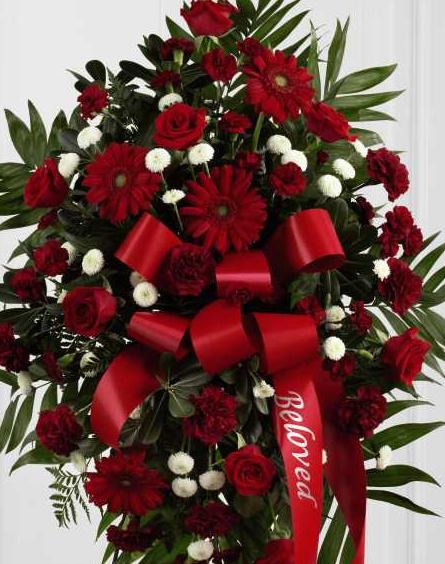 This beautiful standing spray is a rich and colourful way to express your love and devotion. A stunning arrangement in shades of red includes roses, carnations, spray carnations and gerbera with white spray chrysanthemums and lush greens. Accented by red satin ribbon and standing on a wire easel, this standing spray will make a truly beautiful addition to the service.