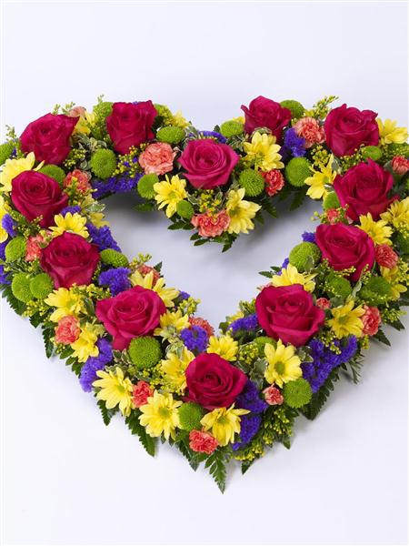 The perfect tribute for a loved one, this open heart shaped display includes fresh flowers in contrasting colours. We’ve included cerise roses, golden yellow spray chrysanthemums, orange spray carnations, cool purple statice and lime green spray chrysanthemums.